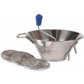 French Food Mill, 5 qt., 12" dia., includes (3) disc-shaped graters 1.5mm 2.5mm and 4.0mm holes, double pulping area, processes 3.30 lbs. per minute, stainless steel
