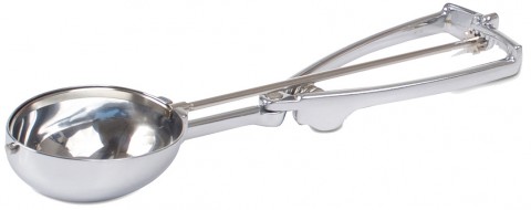 Stockel Scoop, size 20, 2 oz. capacity, 10"L overall, oval, chrome plated brass handles, stainless steel, Made in Germany