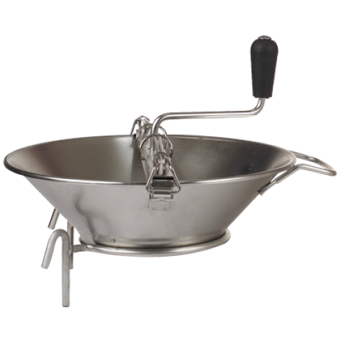 Food Mill, 8 quarts capacity, 14" dia., does not include sieve, double pulping area, processes 10 lbs. per minute, stainless steel