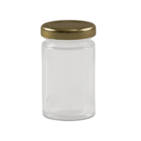 Mini Glass Jar, 2.4 oz., with gold plastic screw top cap, glass, transparent