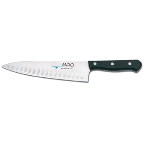 Mac Chef's Knife, 8", stamped, hollow ground, high carbon stainless steel blade, wood handle, black