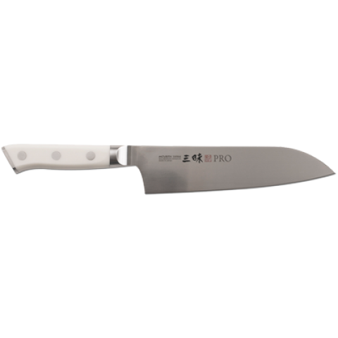 Mcusta Zanmai Pro Santoku Knife, 7" blade (180mm), forged, molybdenum/vanadium steel blade, Dupont Corian handles, white, Made in Japan
