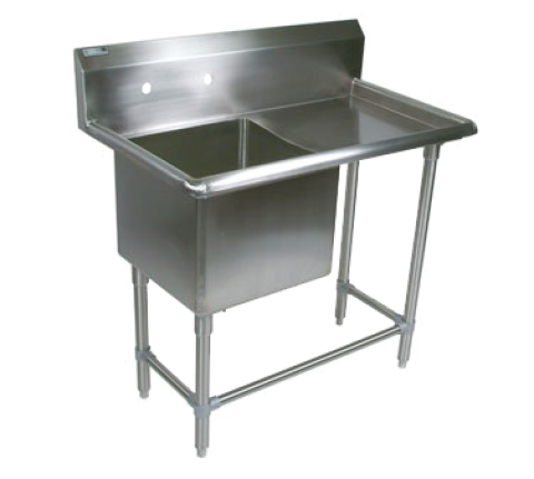Pro-Bowl Sink, 1-compartment, 40-3/16"W x 23-1/2"D x 44-1/16"H overall size, (1) 18"W x 18" front-to-back x 14" deep compartment, (1) 18" right drainboard, 10"H boxed backsplash with 45° top & 2" return, (1) set of splash mount faucet holes with 8" centers, 3-1/2" die-stamped drain opening, 16/300 stainless steel construction, stainless steel legs, adjustable front & side bracing, adjustable bullet feet, NSF, CSA-Sanitation, KD