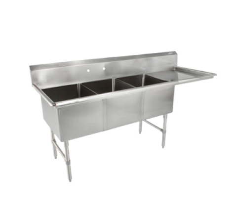 "B" Series Sink, 3-compartment, 70"W x 25-1/2"D x 44"H overall size, (3) 16"W x 20" front-to-back x 14" deep compartments, (1) 18" right drainboard, 10"H boxed backsplash with 45° top and 2" return, (1) set of splash mount faucet holes with 8" centers, 3-1/2" die-stamped drain openings, 16/300 stainless steel construction, stainless steel legs, adjustable side bracing, adjustable bullet feet, NSF, CSA-Sanitation (Available in Effingham and Nevada)