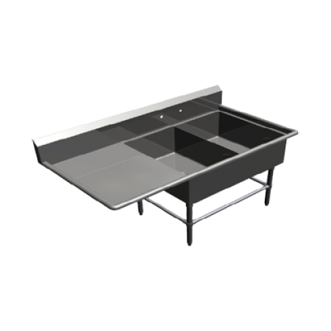 Pro-Bowl Sink, 2-compartment, 68-3/16"W x 33-1/2"D x 44-1/16"H overall size, (2) 20"W x 28" front-to-back x 12" deep compartments, (1) 24" left drainboard, 10"H boxed backsplash with 45° top & 2" return, (1) set of splash mount faucet holes with 8" centers, 3-1/2" die-stamped drain openings, 14/300 stainless steel construction, stainless steel legs, adjustable front & side bracing, adjustable bullet feet, NSF, CSA-Sanitation, KD