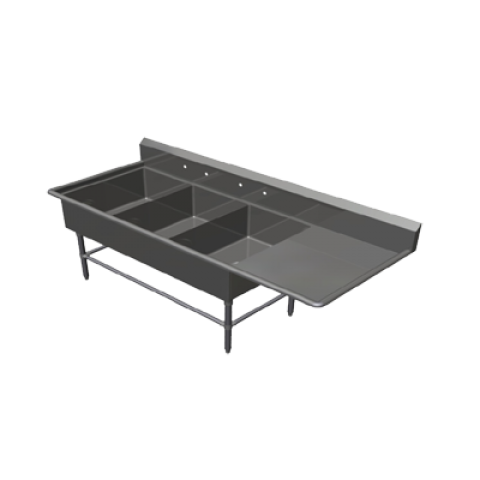 Pro-Bowl Sink, 3-compartment, 84-3/16"W x 33-1/2"D x 44-1/16"H overall size, (3) 20"W x 28" front-to-back x 12" deep compartments, (1) 20" right drainboard, 10"H boxed backsplash with 45° top & 2" return, (1) set of splash mount faucet holes with 8" centers, 3-1/2" die-stamped drain opening, 14/300 stainless steel construction, stainless steel legs, adjustable front & side bracing, adjustable bullet feet, NSF, CSA-Sanitation, KD