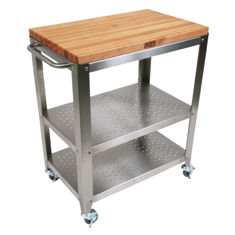 Cucina Culinarté Cart, 30"W x 18-1/8"D x 36"H, removable 1-1/2" thick edge grain cutting board top, Northern Hard Rock Maple, with Oil Finish, stainless steel towel bar, (2) perforated stainless steel undershelves, 3" locking casters, KD