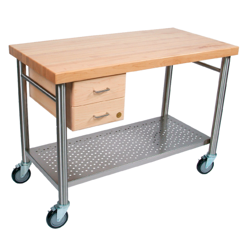 Cucina Magnifico Work Table, 48"W x 24"D x 35"H overall size, 2-1/4" thick edge grain top, Northern Hard Rock Maple, with Varnique finish, stainless steel undershelf, double dovetailed drawer unit left side, stainless steel towel bar, electric outlet strip, 5" locking casters