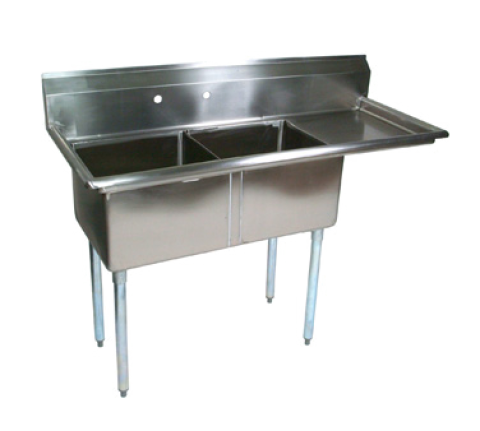 E-Series Sink, 2-compartment, 74-1/2"W x 29-1/2"D x 43-3/4"H overall size, (2) 24"W x 24" front-to-back x 14" deep compartments, (1) 24" right drainboard, 9-3/4"H boxed backsplash with 45° top and 2" return, (1) set of splash mount faucet holes with 8" centers, 3-1/2" die-stamped drain openings, 18/300 stainless steel construction, galvanized legs & gussets, adjustable plastic bullet feet, NSF, CSA-Sanitation