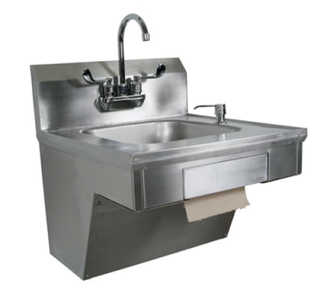 Pro-Bowl Hand Sink, wall mount, 14"W x 16" front-to-back x 5" deep bowl, (1) set of splash mount faucet holes with 4" centers, 1-7/8" drain, drain basket included, soap & towel dispenser, removable front panel, includes mounting bracket, stainless steel construction, ADA compliant, NSF, CSA-Sanitation (Goose neck faucet included with wrist blades)