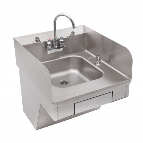 Pro-Bowl Hand Sink, wall mount, 14"W x 16" front-to-back x 5" deep bowl, (1) set of splash mount faucet holes with 4" centers, 1-7/8" drain, drain basket included, left & ride side splashes, soap & towel dispenser, removable front panel, includes mounting bracket, stainless steel construction, ADA compliant, NSF, (Goose neck faucet included with wrist blades)