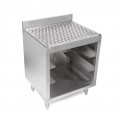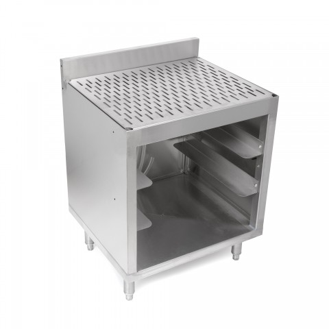 Underbar Glass Rack Storage Unit, 24"W x 21"D x 32-1/2"H overall size, drainboard with top drain and removable perforated insert, 3"H backsplash, open front base, top and bottom drains with drain hose, holds (2) 20" x 20" glass racks with tall stemware or (3) 20” x 20” glass racks with standard height glassware, 18/300 stainless steel construction, stainless steel legs with adjustable stainless steel bullet feet, NSF (weights are subject to additional packaging)