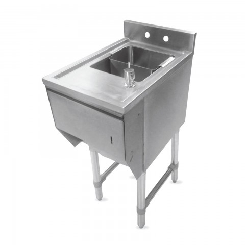 Slim-Line Underbar Hand Sink, freestanding, 12"W x 18"D x 33-1/2"H overall size, (1) 10"W x 8" front-to-back x 6" deep fabricated sink bowl, 3"H backsplash, (1) set of removable splash mount faucet holes with 4" centers, deck mount soap dispenser & front mount towel dispenser, 18/300 stainless steel construction, stainless steel legs & side bracing, adjustable stainless steel bullet feet, NSF (weights are subject to additional packaging)