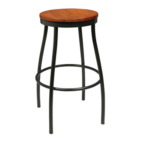 Industrial Collection Bar Stool, backless, wood seat, metal frame with textured black powder coat finish, footrest, black nylon glides, Quick Ship