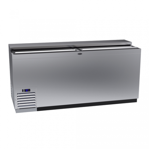 Bottle Cooler, flat top, 72"W x 24"D, self-contained refrigeration, (25.5) cases/12oz bottles capacity, (2) sliding lids, (4) adjustable chrome plated divider racks, digital thermostat, includes condensate evaporator, stainless steel interior, stainless steel exterior front & sides, R290 Hydrocarbon refrigerant, 1/3 HP, 115v/60/1-ph, 2.53 amps, cord with NEMA 5-15P, NSF7, ETL-Sanitation