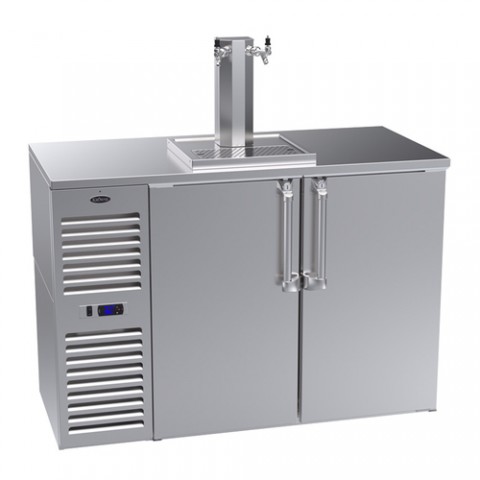Draft Beer Cooler, two-section, 52"W x 25"D, side mounted self-contained refrigeration, (1) stainless steel draft beer tower with (2) faucets & 16.25" x 15" drain pan, 30°F to 40°F temperature range with DynamicChill 360° technology, (2) heavy duty self-closing doors with locks, (2) reinforced stainless steel keg floors and built-in kick plates, digital thermostat, 20 gauge stainless steel interior with coved corners, includes condensate evaporator, R290 Hydrocarbon refrigerant, 1/4 HP, 115v/60/1-ph, 2.2 amps, cord with NEMA 5-15P, ETLus, ETL-Sanitation