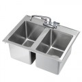 Hand Sink, two-compartment, drop-in, 26"W x 18"D x 10"H OA, (2) 10" wide x 14" front-to-back x 10" deep compartments, 4" OC deck mount faucet with 10" spout, (2) 3-1/2" drains, stainless steel construction, NSF (22-1/4"W x 16-3/4"D cut-out required)