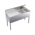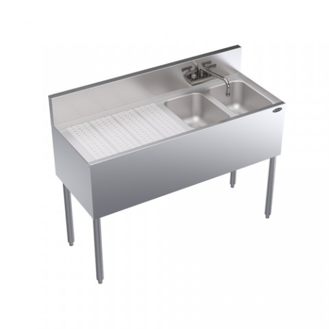 Royal Series Underbar Sink Unit, two compartment, 48"W x 19"D, 10" wide x 14" front-to-back x 10" deep compartments, 24" embossed drainboard on left, splash mount Royal Series faucet with swing spout, apron on front & sides, (2) removable overflow standpipes, stainless steel top, front, & sides, stainless steel legs with adjustable thermoplastic bullet feet, NSF