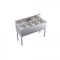Royal Series Underbar Sink Unit, four compartment, 48"W x 19"D, 10" wide x 14" front-to-back x 10" deep compartments, splash mount Royal Series faucet with double jointed spout, apron on front & sides, (4) removable overflow standpipes, stainless steel top, front, & sides, stainless steel legs with adjustable thermoplastic bullet feet, NSF