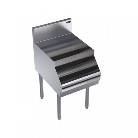 Royal Series Underbar Liquor Bottle Display Unit, freestanding, 18"W x 24"D (to match speedrail depth), holds (16) liquor bottles, (4) bottle steps with guard rails, stainless steel top, front, & sides, galvanized steel back & bottom, stainless steel legs with adjustable thermoplastic bullet feet, NSF