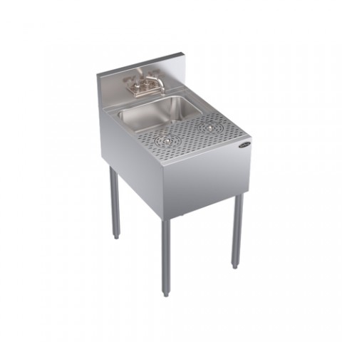 Royal Series Underbar Speed Station, 18"W x 24"D O.A., dump sink, (2) high performance push-down glass rinser faucets with pressure regulators, 10" x 14" x 7" deep sink bowl, splash mount Royal Series faucet, 1-1/2" center drain, perforated stainless cutout, stainless steel top, front, stainless steel legs with adjustable thermoplastic bullet feet, NSF