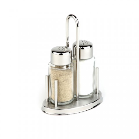 Salt & Pepper Cruet Set, 3-piece, 4-1/4"L x 2-3/4"W x 6"H, includes: (2) 6-3/4 oz., 3-1/2"H, clear glass shakers, with stainless steel covers & (1) stainless steel cruet, dishwasher safe, Classic, APS® Germany (36 each per case)