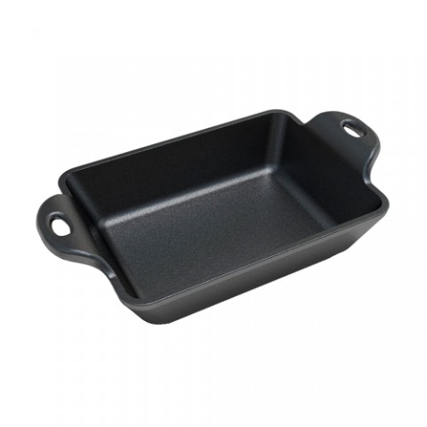 Mini Server, 14 oz., 7-3/4"L x 4-1/2"W x 1-15/16"H (exterior), rectangular, with handles, heat-treated (rust resistant), stove top/induction/grill/campfire/oven safe, seasoned with oil, dishwasher safe, cast iron, Made in USA