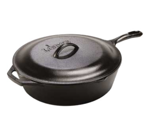 Skillet, 5 quart, 12-9/10" dia. x 4-1/8"H (exterior), round, with helper handle, cover with integral handle & self-basting tips, stove top/induction/grill/campfire/oven safe, seasoned with oil, hand wash only, cast iron, Made in USA