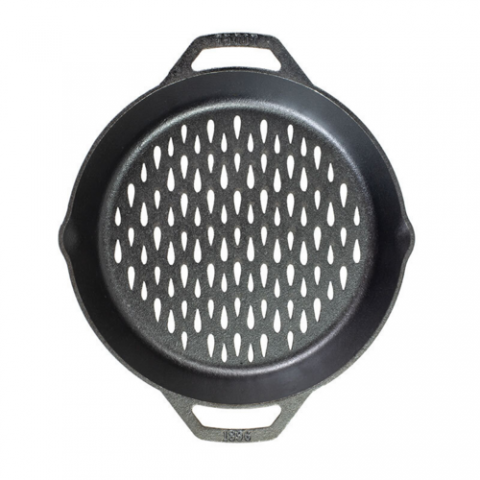 Grill Basket, 12" dia. x 2-1/4"H, dual handled, stove top/induction/grill/campfire/oven safe, seasoned with oil, hand wash only, cast iron, Made in USA
