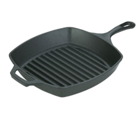 Grill Pan, 10-1/2" x 2-5/8"H (exterior), with helper handle, square, stove top/induction/grill/campfire/oven safe, seasoned with oil, hand wash only, cast iron, Made in USA