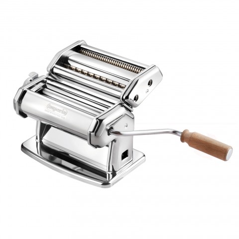 Imperia 150 Pasta Machine, 7-1/2" x 7" x 6-1/3", counter top, includes: (1) smooth fixed cutter, (1) detachable double cutter, (1) 2mm fettuccine, & (1) 6.5mm tagliatelle, manual, push button adjustable thickness, chrome plated steel rollers