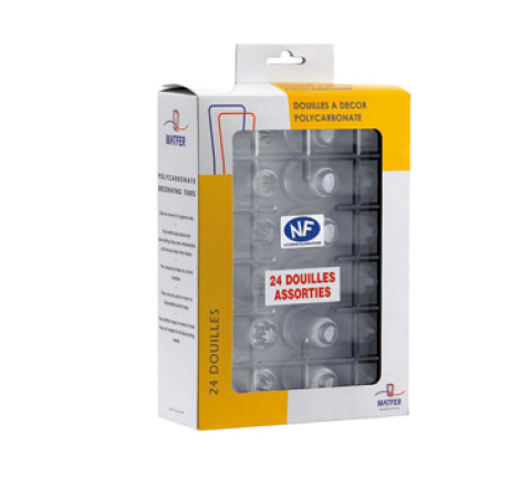 Decorating Tube Tip Set, unbreakable, non-deformable, transparent, polycarbonate, 24 pieces include: 12-plain (U1 - U12) & 10-scalloped (A6, A8, B6, B8, C6,C8, D6, D8, E6 & E8), 1-(#2) leaf & 1 tube for Yule logs, made in France (set of 24) NF Certification