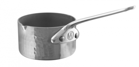 M'Minis Mini Sauce Pan, 6.7 oz. (0.2 liter), 2-7/10" dia. x 2"H, round, without lid, straight edge, pour edge, riveted cast stainless steel handle, gas/electric/halogen, 1.5mm, 18/10 stainless steel, hammered finish
