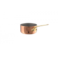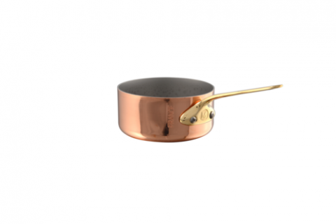 M'Minis Mini Sauté Pan, 3.2 oz. (0.1 liter), 2-3/4" dia. x 1-3/5"H, round, without lid, straight edge, riveted bronze handle, gas/electric/halogen, 18/10 stainless steel interior, bi-laminated copper exterior, polished finish