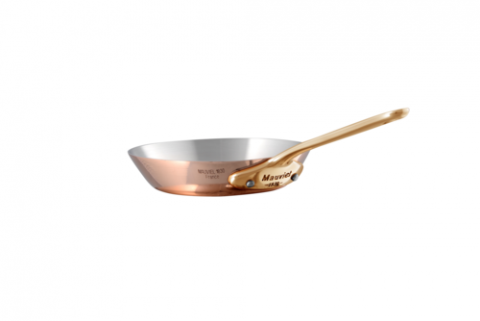 M'Minis Mini Fry Pan, 4-4/5" dia. x 9/10"H, round, straight edge, riveted bronze handle, gas/electric/halogen, 18/10 stainless steel interior, bi-laminated copper exterior, polished finish