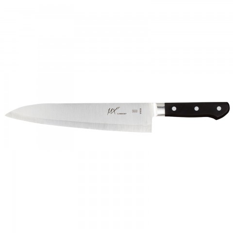 MX3® Gyuto Knife, 240mm (9-1/2"), one-piece, full tang, forged, 3-layer, Japanese VG-10 super-steel core blade, taper-ground edge, triple riveted, ergonomic Delrin® handles