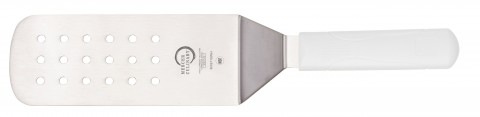Millennia® Turner, 8"L x 3"W, 14-3/4" overall length, perforated Japanese steel blade, white molded polypropylene handle (for HACCP or dedicated use option), NSF