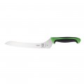 Millennia Colors® Bread Knife, 9", offset, wavy edge, stamped, high carbon, Japanese steel, green non-slip Santoprene® & polypropylene handle, with textured finger points and protective finger guard, NSF