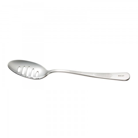 Plating Spoon, 7-7/8"L, slotted, deep well bowl with mirror finish, dual micro-serration for better grip and control, satin finish handle, 18/8 stainless steel