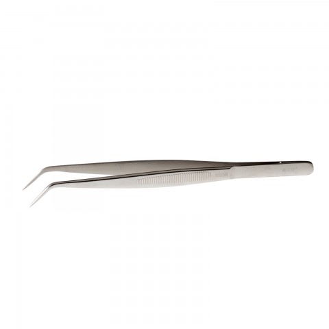 Precision Tongs, 6-1/8" L, fine point, curved tip style, micro-serration on outside for stability, serrated tips on inside, hardened 18/8 stainless steel