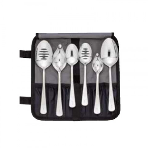 Plating Spoon Set, 7-piece, includes: (1) M35142 saucier, (1) M35143 petite saucier, (1) M35138 9" solid, (1) M35140 7-7/8" solid, (1) M35139 9" slotted, (1) M35141 7-7/8" slotted and (1) M30920 heavy duty compartment roll