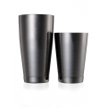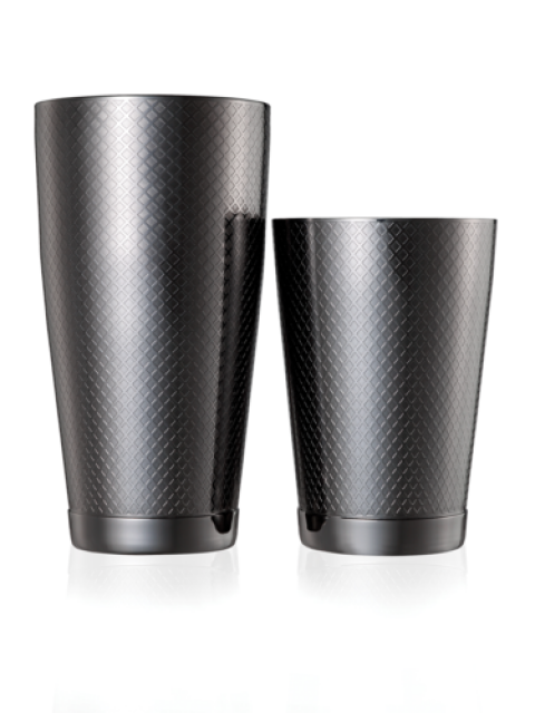Barfly® Diamond Lattice Cocktail Shaker Set, includes: (1) each 28 oz. & 18 oz. shaker, capped bottom, 18/8 stainless steel core, satin finish interior, black exterior finish, intricate etched pattern design