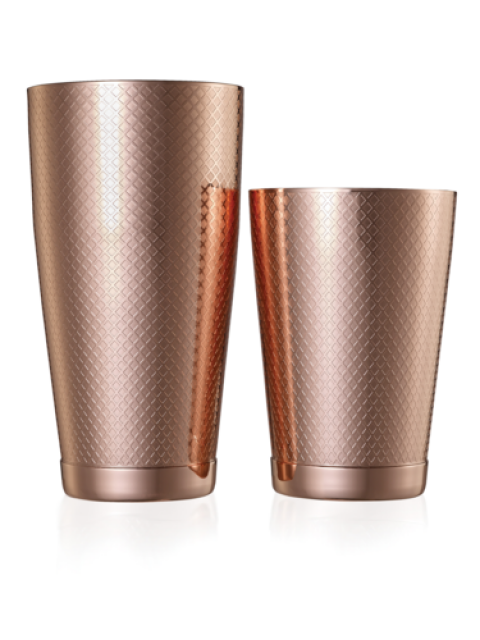 Barfly® Diamond Lattice Cocktail Shaker Set, includes: (1) each 28 oz. & 18 oz. shaker, capped bottom, 18/8 stainless steel, satin finish interior, copper-plated exterior finish, intricate etched pattern design