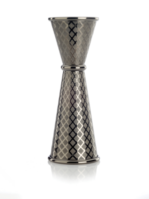 Barfly® Diamond Lattice Japanese Style Jigger, 1 oz. & 2 oz., with internal marking lines, 18/8 stainless steel core, gun metal black-plated finish