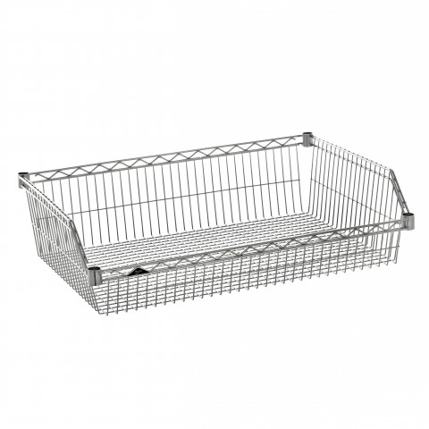 Super Erecta® Basket Shelf, 48"W x 18"D, hopper style, 5" basket height in front, 9" height on sides and rear, 1" wire spacing, chrome plated finish, NSF