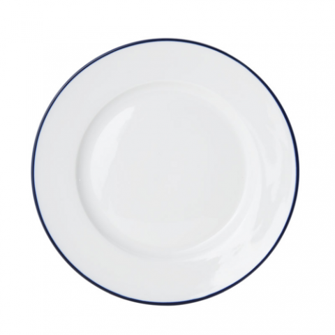 Bistro Plate, 9" dia., round, wide rim, dishwasher, microwave, freezer and oven safe, vitrified porcelain, white with blue band (must be purchased in case quantities)