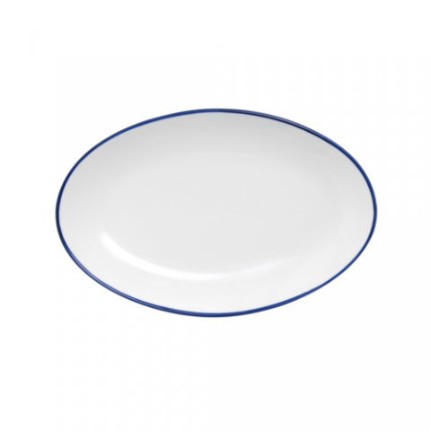 Bistro Entree Plate, 11-3/4"L x 7-1/2"W, oval, coupe, dishwasher, microwave, freezer and oven safe, vitrified porcelain, white with blue band (must be purchased in case quantities)
