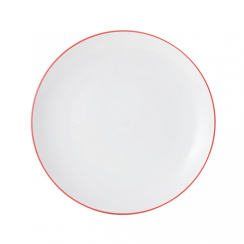 Bistro Plate, 10" dia., round, coupe, dishwasher, microwave, freezer and oven safe, vitrified porcelain, white with red band (must be purchased in case quantities)