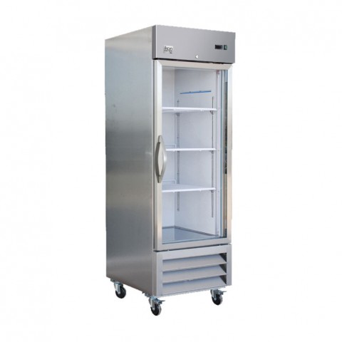 IKON Refrigeration Freezer, reach-in, one-section, bottom mount self-contained refrigeration, 19 cu. ft. capacity, 26-8/10"W x 33-1/10"D x 83-1/10"H, (1) locking glass door, (4) adjustable shelves, electronic thermostat, clip-on shelf tag holders, 0° to -10°F temperature range, digital LED temperature display, stainless steel interior & front, R290 refrigerant, 4" casters (2) braked, 1/2 HP, 115v/60/1-ph, 8 amps, cord, NEMA 5-15P, ETL-Sanitation, cELTus