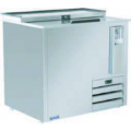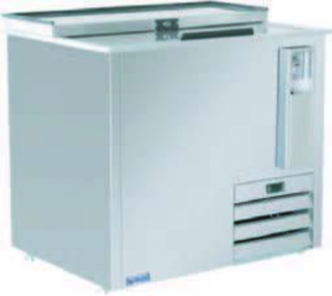 IKON Refrigeration Bottle Cooler, flat top, 10 cu. ft. capacity, 36-4/5"W x 27"D x 35"H, deep well, stainless steel top with rear raised glass rails, sliding lid (lockable), electronic thermostat, 33° to 41°F temperature range, digital LED temperature display, bottle opener with cap catcher, stainless steel interior & exterior, side mounted self-contained refrigeration, R-600A refrigerant, 1" wheels, 3/8 hp, 115v/60/1-ph, 1.8 amps, cord with NEMA 5-15P, cETLus, ETL-Sanitation